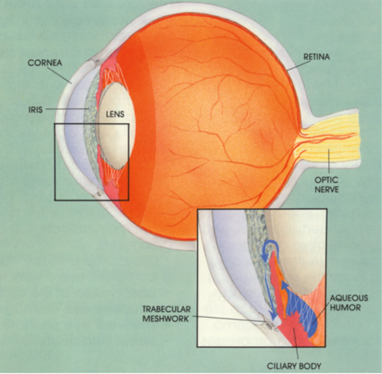 The front part of the eye, the anterior and posterior chambers, is filled with a fluid called aqueous humor. This fluid maintains normal pressure inside the eyeball, preventing it from collapsing ––like a balloon filled with air. The fluid is constantly produced by the ciliary body and drains back to the bloodstream through the trabecular meshwork. Blockage or overproduction of the fluid elevates pressure (intraocular pressure) within the eyeball.